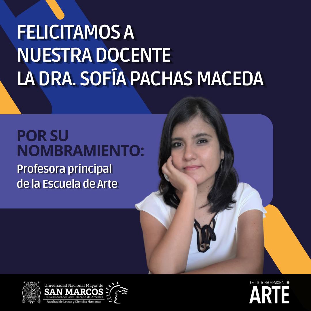 Informamos a la comunidad de Arte y de la Facultad de Letras y Ciencias Humanas que, nuestra docente, la Dra. Sofía Pachas Maceda ha sido nombrada como docente de categoría principal de la Escuela Profesional de Arte.