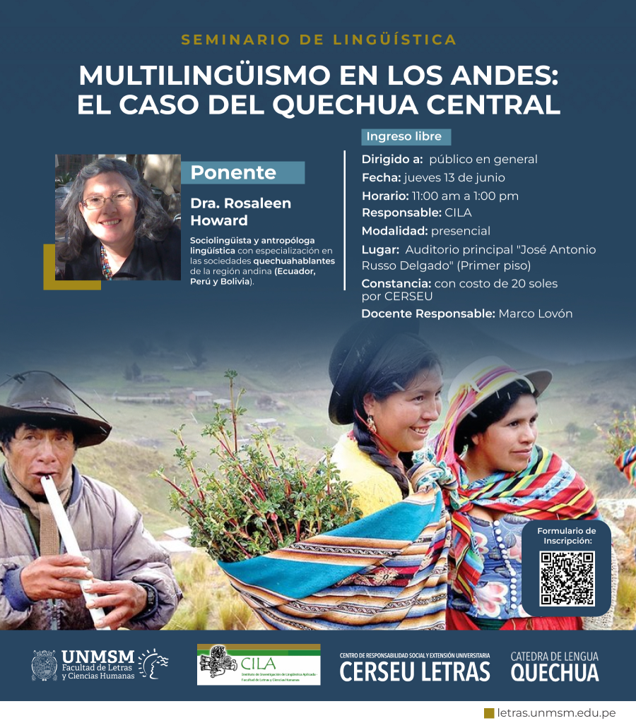 2022: XII Coloquio Internacional de Lengua y Cultura de los Andes «Félix Quesada Castillo» Investigaciones Lingüísticas y Literaturas Andinas2021: XI Coloquio de Lengua y Cultura de los Andes «AUGUSTO ESCRIBENS TRISANO» Investigaciones Lingüísticas y Literarias2019: X Coloquio de Lengua y Cultura en los Andes: Investigaciones Lingüísticas y Literaturas AndinasSe han llevado a cabo talleres como “Aportes para el estudio de la tradición oral del quechua central” en 2017, a cargo de la catedrática de Estudios Hispánicos de la Universidad de Newcastle (Reino Unido), Rosaleen Howard, sociolingüista y antropóloga lingüística con especialización en las sociedades quechuahablantes de la región andina.