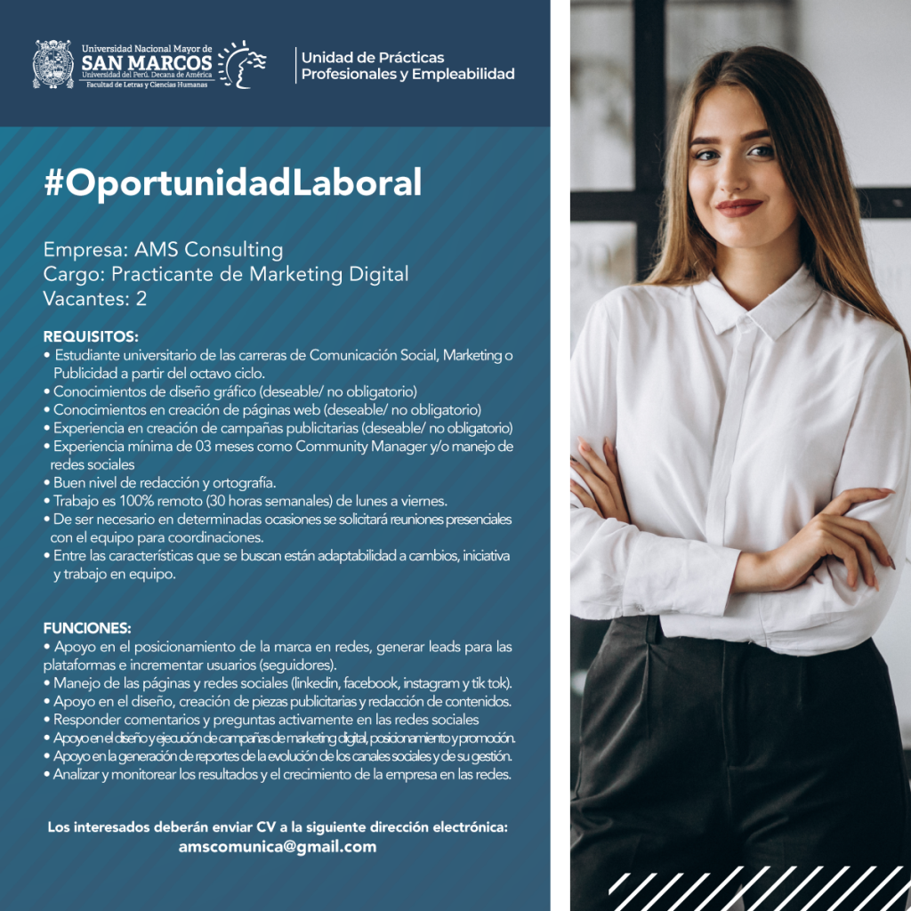 ? A través de la Unidad de Prácticas Profesionales y Empleabilidad, compartimos la siguiente oportunidad laboral recibida a través de nuestro portal de empleo. #UnidadDePracticasProfesionalesyEmpleabilidad #UPPELetras #UNMSM