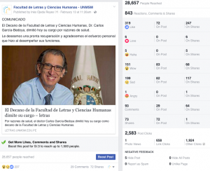 La comunidad sanmarquina de la FLCH sigue manifestando su preocupación y respeto por el Dr. Carlos García-Bedoya, más de 28 mil personas visualizaron la noticia de su renuncia y unas 841 personas comentaron y expresaron su consternación. Durante esa semana, nuestra web y redes sociales alcanzaron a más de 66 mil personas y los videos con los saludos de los colaboradores y amigos fueron vistos 5,939 veces. Queremos agradecer a toda la comunidad (profesores, alumnos, egresados, trabajadores) por sus muestras de cariño hacia el Dr. Carlos García-Bedoya, su respaldo institucional al Mg. José Carlos Ballón y su compromiso con la Facultad de Letras y Ciencias Humanas.