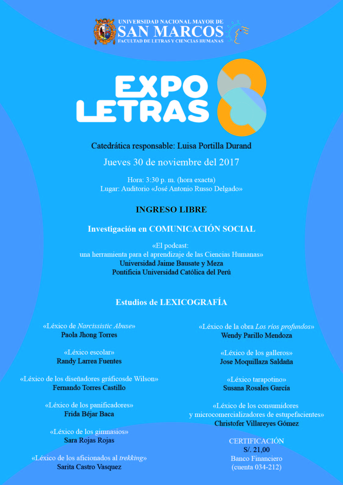 Este año 2017, en EXPOLETRAS VIII se presentarán ponencias relacionadas con la Comunicación Social: «El podcast: una herramienta para el aprendizaje de las Ciencias Humanas», así como estudios relacionados con la Lexicografía: «Léxico de Narcissistic Abuse», «Léxico de los diseñadores gráficos de Wilson», «Léxico de la obra Los ríos profundos», «Léxico tarapotino», «Léxico de los panificadores», «Léxico de los gimnasios», «Léxico de los aficionados al trekking», «Léxico de los consumidores y microcomercializadores de estupefacientes», «Léxico de los galleros» y «Léxico escolar».