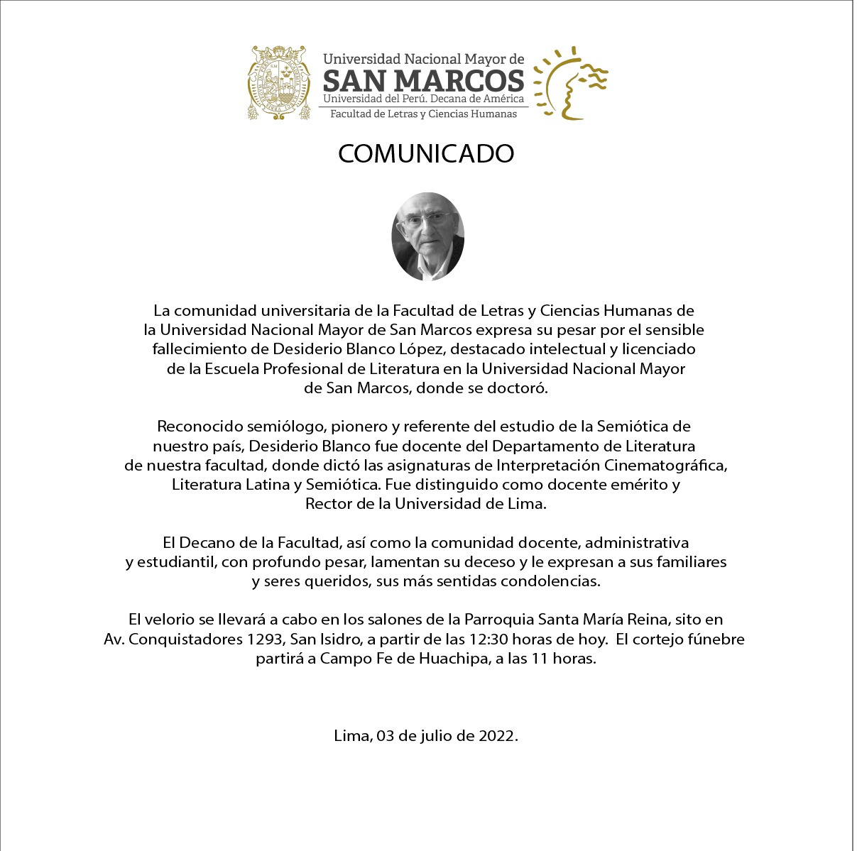 La comunidad universitaria de la Facultad de Letras y ciencias Humanas de la UNMSM expresa su pesar por el sensible fallecimiento de Desiderio Blanco López