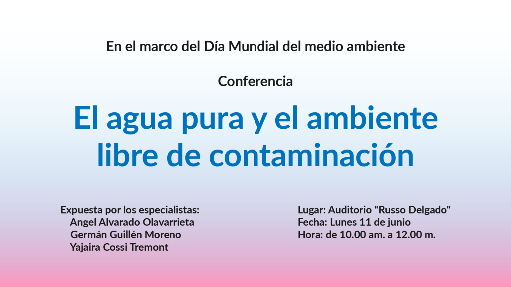 Es por ello, que en el marco del Día mundial del Medio Ambiente se llevará a cabo en nuestra facultad, la Conferencia «El agua pura y el ambiente libre de contaminación».