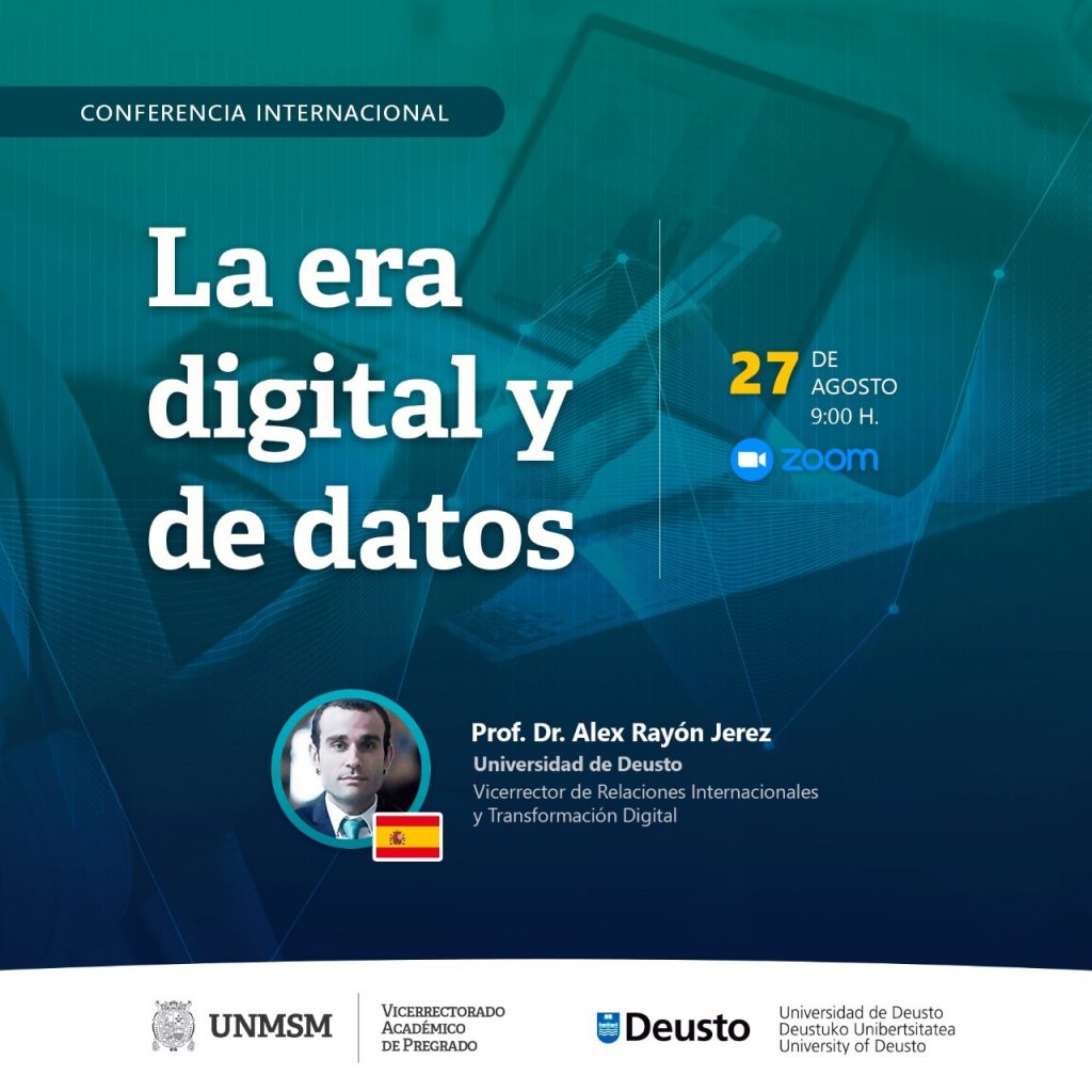 El Vicerrectorado Académico de Pregrado, invita a participar de la conferencia internacional «La era digital y de datos», con la ponencia del Prof. Dr. Alex Rayón Jeréz, Vicerrector de Relaciones Internacionales y Transformación Digital de la Universidad de Deusto y director de Deusto BigData.