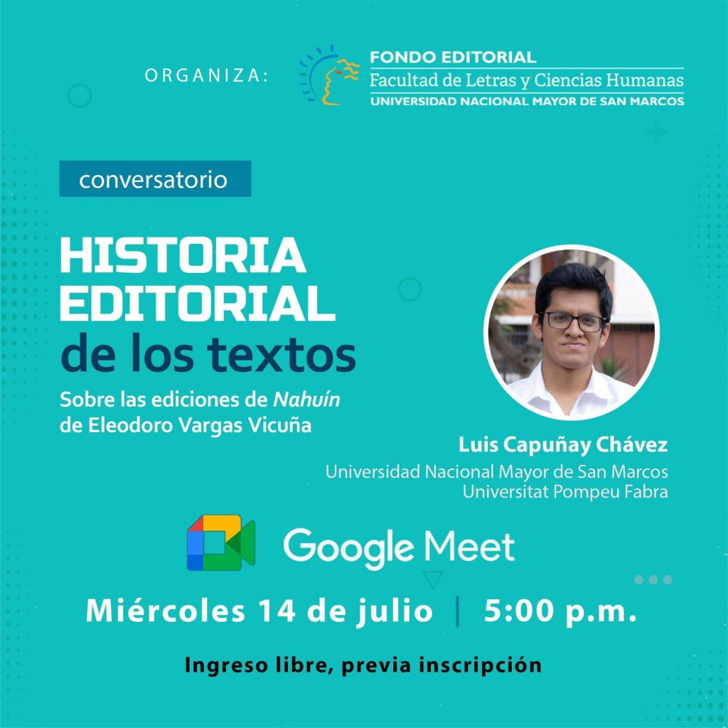El Fondo Editorial de la Facultad de Letras y Ciencias Humanas invita al público interesado en temas de investigación del campo editorial, al tercer conversatorio que tiene como eje temático la historia editorial del libro de cuentos Nahuín, de Eleodoro Vargas Vicuña (Cerro de Pasco, 1924 – Lima, 1997).