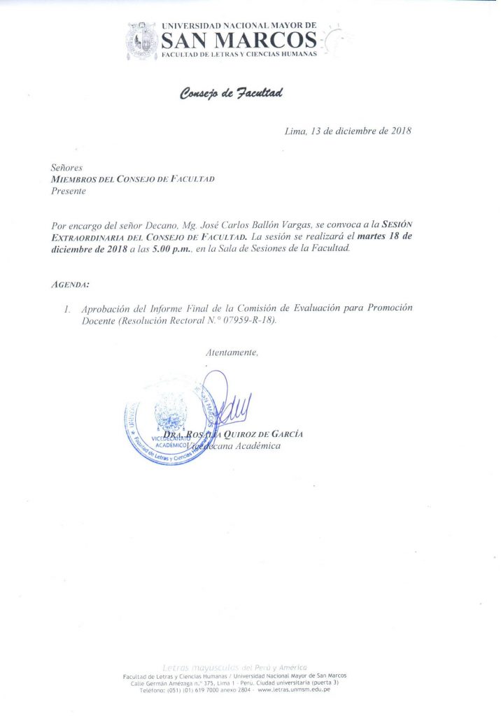 Por encargo del Señor Decano se convoca a sesión extraordinaria del Consejo de Facultad de Letras y Ciencias Humanas, que se realizará el martes 18 de diciembre de 2018, a las 5:00 p.m.