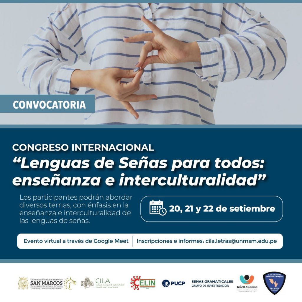 El Instituto de Investigaciones de Lingüística Aplicada (CILA) de la Facultad de Letras y Ciencias Humanas de la Universidad Nacional Mayor de San Marcos (UNMSM), el IEP Bilingüe Inmaculada – Centro Especializado, Señas Gramaticales – Grupo de Investigación y la Asociación Nacional de Intérpretes Sordos y Oyentes de Lengua de Señas Peruana Núcleo Somos convocan a la comunidad universitaria e interesados en la enseñanza, promoción y uso de las lenguas de señas (investigadores, profesores, egresados, estudiantes, usuarios) a participar en el Congreso Internacional intitulado “Lenguas de Señas para todos: enseñanza e interculturalidad”. El Congreso se realizará de manera virtual los días miércoles 20, jueves 21 y viernes 22 de septiembre de 2023 en el marco del Día Internacional de las Lenguas de Señas, que la ONU rememora como 23 de septiembre.