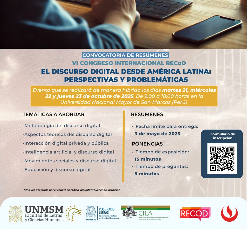 Está abierta la convocatoria para el envío de propuestas para participar del VI Congreso Internacional de RECoD “El discurso digital desde América Latina: perspectivas y problemáticas”, que se realizará en modalidad híbrida (presencial y virtual) del 21 al 23 de octubre en la Universidad Nacional Mayor de San Marcos (Lima, Perú).