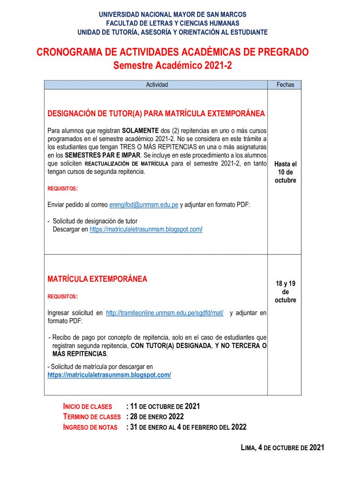 CRONOGRAMA DE ACTIVIDADES ACADÉMICAS DE PREGRADO – Semestre Académico 2021-2
