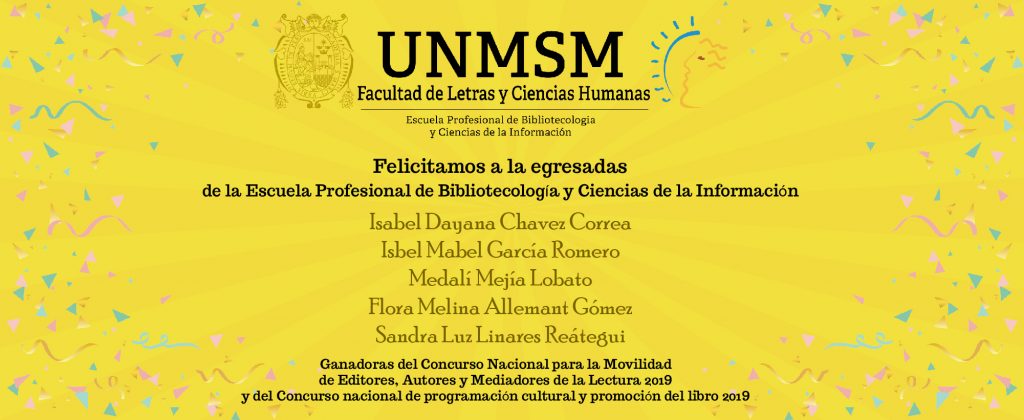 El 25 de setiembre, del presente año, fueron publicados los resultados de los concursos de ESTÍMULOS ECONÓMICOS PARA EL LIBRO Y EL FOMENTO DE LA LECTURA y grata fue la sorpresa el descubrir que cinco de las ganadoras de este financiamiento son egresadas de la Escuela Profesional de Bibliotecología y Ciencias de la Información de nuestra facultad.
