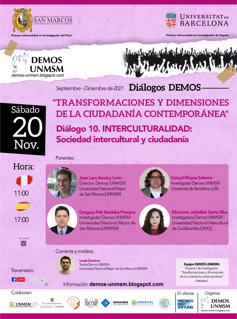 Este sábado 20 de noviembre de 2021 continúan nuestros DIÁLOGOS DEMOS (septiembre-diciembre) que se realizan cada semana de 11 a 13h hora de Perú y de 18 a 20h hora de España.