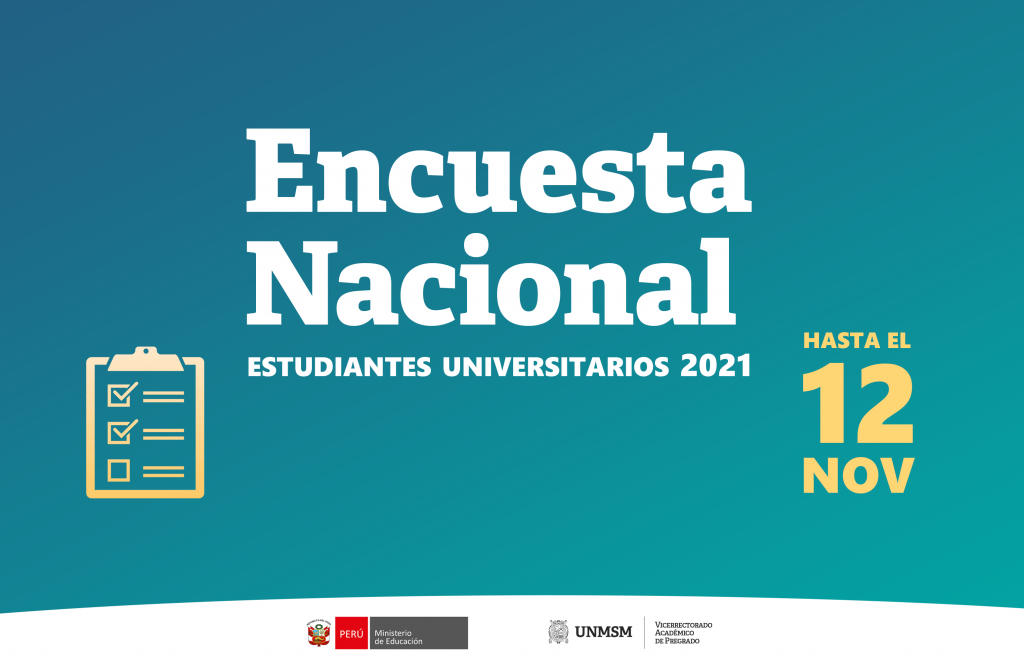 El Ministerio de Educación desarrolla la Encuesta Nacional de Estudiantes Universitarios 2021. En el marco del convenio N° 029-2021-MINEDU, la Universidad Nacional Mayor de San Marcos tiene el compromiso de cumplir con el 100% del recojo de información a través de las encuestas a la muestra de estudiantes asignada, por ello solicitamos todo su compromiso y responsabilidad para culminar exitosamente este procedimiento.