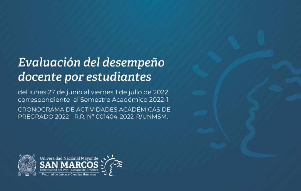 Los estudiantes deben ingresar a su cuenta del SUM y responder la Evaluación del desempeño docente por estudiantes, del lunes 27 de junio al viernes 1 de julio de 2022, correspondiente al Semestre Académico 2022-1, de acuerdo al CRONOGRAMA DE ACTIVIDADES ACADÉMICAS DE PREGRADO 2022 – R.R. Nº 001404-2022-R/UNMSM.