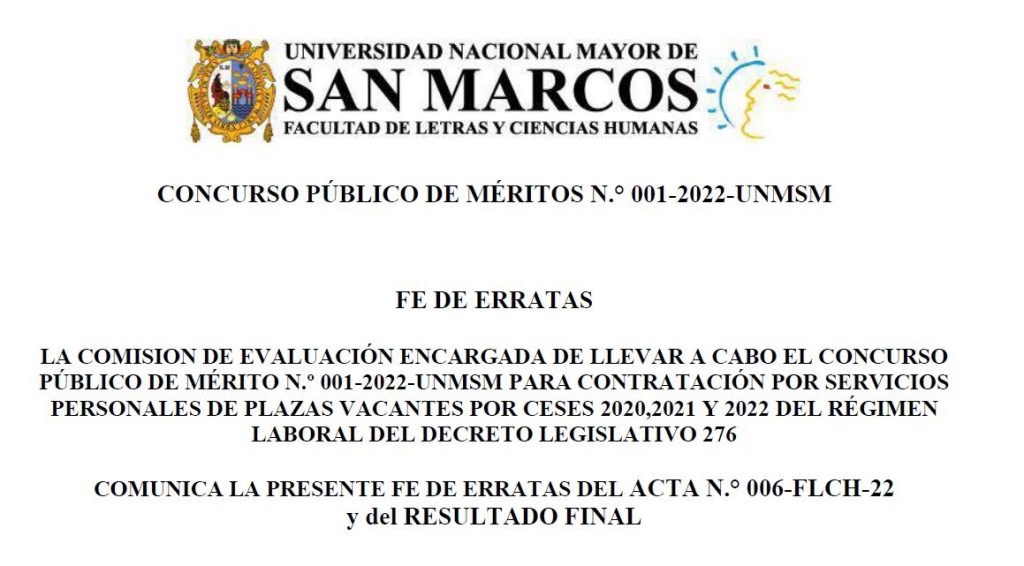 Fe de Erratas -Concurso Público de Méritos 001-2022-UNMSM_c Artículo anterior Artículo siguiente Los comentarios están cerrados.