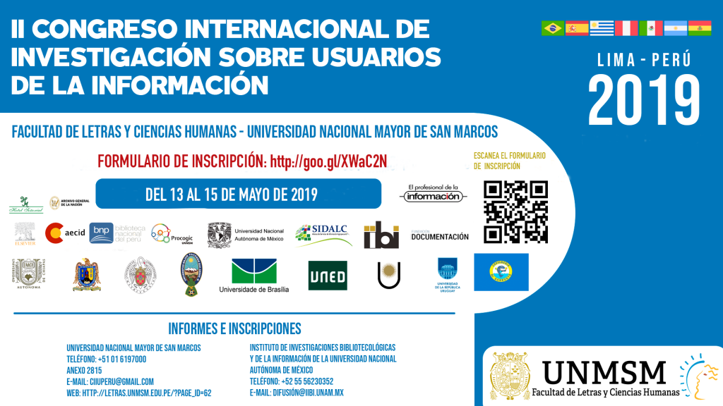 La Escuela Profesional de Bibliotecología y Ciencias de la Información de la Facultad de Letras y Ciencias Humanas de la Universidad Nacional Mayor de San Marcos (UNMSM), El Instituto de Investigaciones Bibliotecológicas y de la Información de la Universidad Nacional Autónoma de México (UNAM) y las otras ocho universidades participantes: Universidad Nacional del Nordeste, Universidad Mayor de San Andrés, Universidad de Brasilia, Universidad Complutense de Madrid, Universidad de la República, Universidad Nacional de Educación a Distancia, Universidad Autónoma de San Luis Potosí y Universidad Autónoma de Chiapas; convocan a los profesores, investigadores, profesionales de la información, estudiantes de licenciatura y posgrado en Archivística, Bibliotecología, Biblioteconomía y Documentación, así como de las Ciencias de la Información, incluyendo al personal profesional relacionado con los servicios archivísticos, bibliotecarios y de la información vinculados con el alcance teórico, epistemológico, metodológico y técnico de los estudios de usuarios de la información a participar en el II Congreso Internacional de Investigación sobre Usuarios de la Información “II CIISUI 2019” que tendrá lugar en el auditorio “José Antonio Russo Delgado” de la Facultad de Letras y Ciencias Humanas de la Universidad Nacional Mayor de San Marcos en la ciudad de Lima, Perú, del 13 al 15 de mayo de 2019.