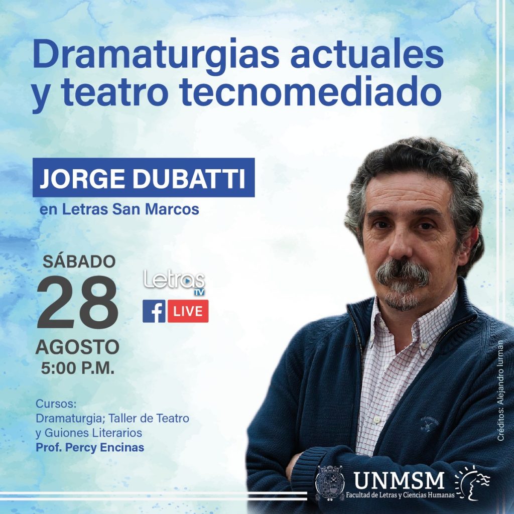 Este sábado 28 de agosto, tenemos la visita de Jorge Dubatti en los cursos: Dramaturgia; Taller de Teatro y Guiones Literarios a cargo del Prof. Percy Encinas. Sigue la conversa y envía tus preguntas y comentarios a través del FB Live ¡No te lo pierdas!