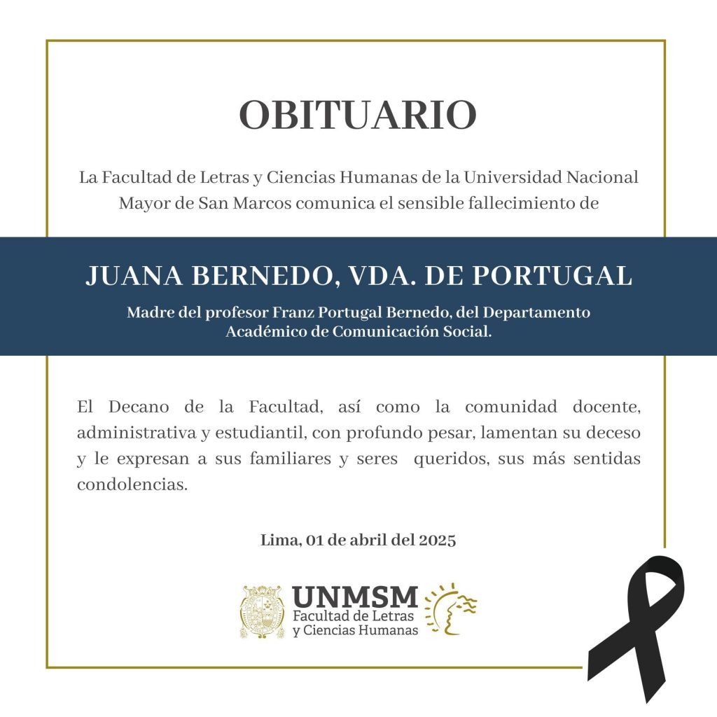 La Facultad de Letras y Ciencias Humanas de la UNMSM expresa su profundo pesar por el fallecimiento de Juana Bernedo, Vda. de Portugal, madre del profesor Franz Portugal Bernedo, miembro de nuestra comunidad académica.