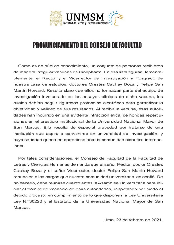 Pronunciamiento del Consejo de Facultad de la Facultad de Letras y Ciencias Humanas de la Universidad Nacional Mayor de San Marcos