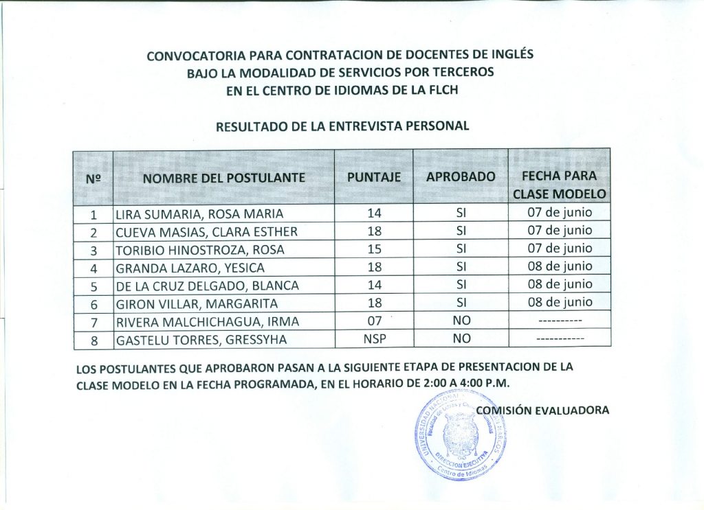 Resultados de la Entrevista Personal para Contratación de docentes de inglés bajo la modalidad de servicios por terceros
