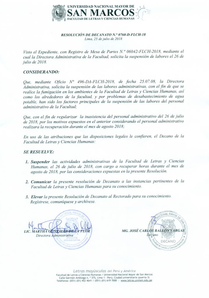Se suspenden las labores administrativas en la Facultad de Letras y Ciencias Humanas el día 26 de julio