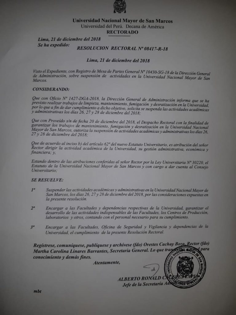 El rectorado suspendió actividades académicas y administrativas en la Universidad Nacional Mayor de San Marcos, los días 26, 27 y 28 de diciembre del 2018, mediante Resolución Rectoral Nº 08417-r-18 de fecha 21 de diciembre. Empero, cabe referir que en el artículo 2, del mencionado acto resolutivo «se encarga a las Facultades y dependencias respectivas de la Universidad, garantizar el desarrollo de las actividades indispensables de las Facultades, los Centros de Producción, Laboratorios y otros, contando con el personal necesario para su cumplimiento».