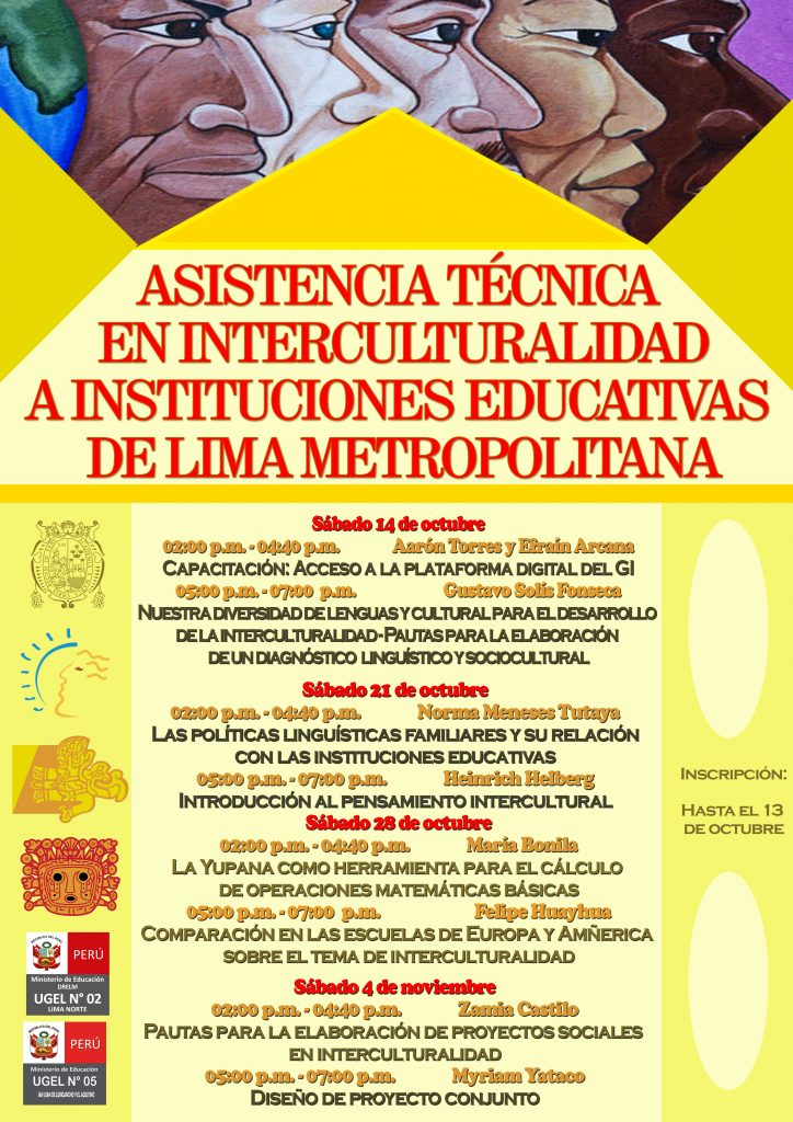 El TALLER DE ASISTENCIA TÉCNICA EN INTERCULTURALIDAD A INSTITUCIONES EDUCATIVAS DE LIMA METROPOLITANA organizado por el Grupo Investigación Intercultural para la Formación Docente y Enseñanza de Lenguas de la Universidad Nacional Mayor de San Marcos (KAWSASUN), tendrá lugar los días sábado 14, 21, 28 de octubre y 04 de noviembre en la de la Facultad de Letras.
