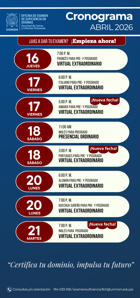 Oficina de Examen de Suficiencia en Idiomas Facultad de Letras y Ciencias Humanas – UNMSM Calle Germán Amézaga N.° 375, Lima 1 – Ciudad Universitaria (puerta N.° 3) WhatsApp: 914033108 Horario de atención: de 9:00 a.m. – 1:00 p.m. y de 2:00 p.m. – 5:00 p.m. Correo electrónico: examensuficiencia.flch@unmsm.edu.pe